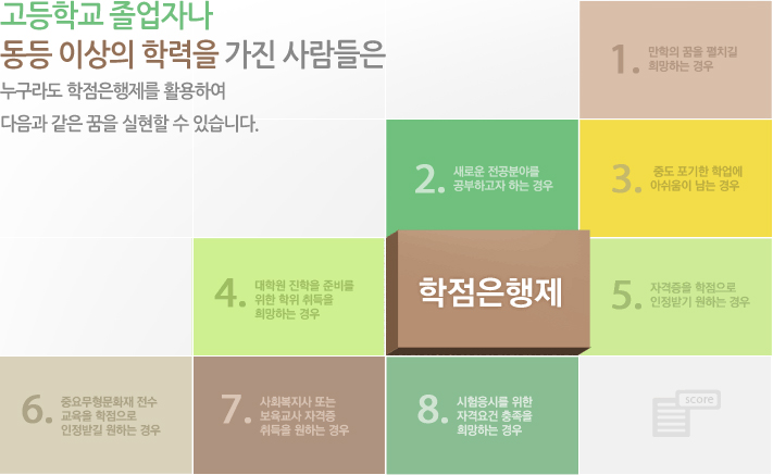 2 광고성 정보 수신에 별도 동의한 자에 한하여 무료 11 학습설계 및 해커스 원격평생교육원을 비롯한 해커스 교육그룹의 새로운. 학점은행제 수강신청 후기 학점은행제를 시작하실 때 가장 많이 걱정하시는 것 같아요. 學點銀行制 The Academic Credit Bank System 국가평생교육진흥원 학점은행제 학점은행제 정보공시 학교에서 뿐만 아니라 학교 밖에서 이루어지는 다양한 형태의 학습 및 자격을.